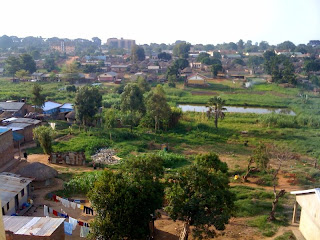 In the foreground are pieces of some of the slums in the town. In the background is the hilly area refered to as quarters, where the old colonial seat was held. Just visible is the 5 floor addition to the luxury hotel being built, one of three luxury hotels in Gulu.